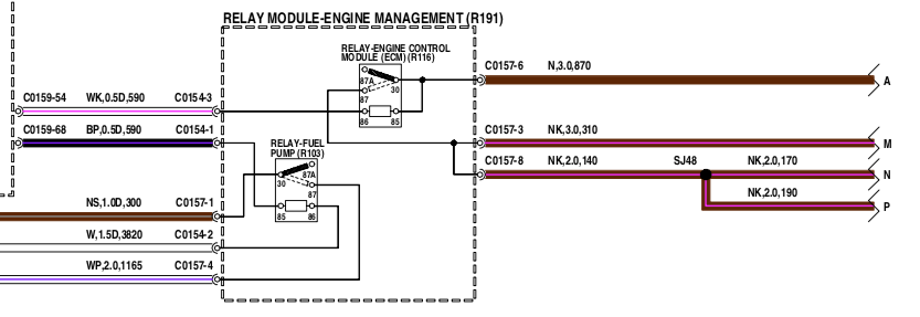 Das Relais schaltet nun den Dauerstrom, gesteuert von Pin 54 des kleinen ECU-Steckers (gegen Masse schaltend) die 12V-Stromversorgung der Leitungen M, N, P im Schaltplan ein. Damit ist auch klar, warum bei Abziehen des kleinen Steckers nichts passiert, in dem Fall schaltet das Relais ja gar nicht durch. Dateianhang: