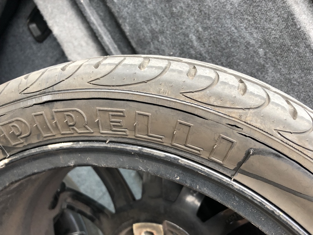 Da hatte ich doch gestern Abend noch ’nen Noteinsatz bei Adrian in Nörvenich. Hinterreifen links platt, bei der Sichtkontrolle fielen dann Risse an der Innenseite der Hinterreifen auf. Pirelli P-Zero Nero GT von 2013, also sechs Jahre alt. War bei der Vorbesitzerin Garagenfahrzeug mit Saisonkennzeichen, wenig Laufleistung.