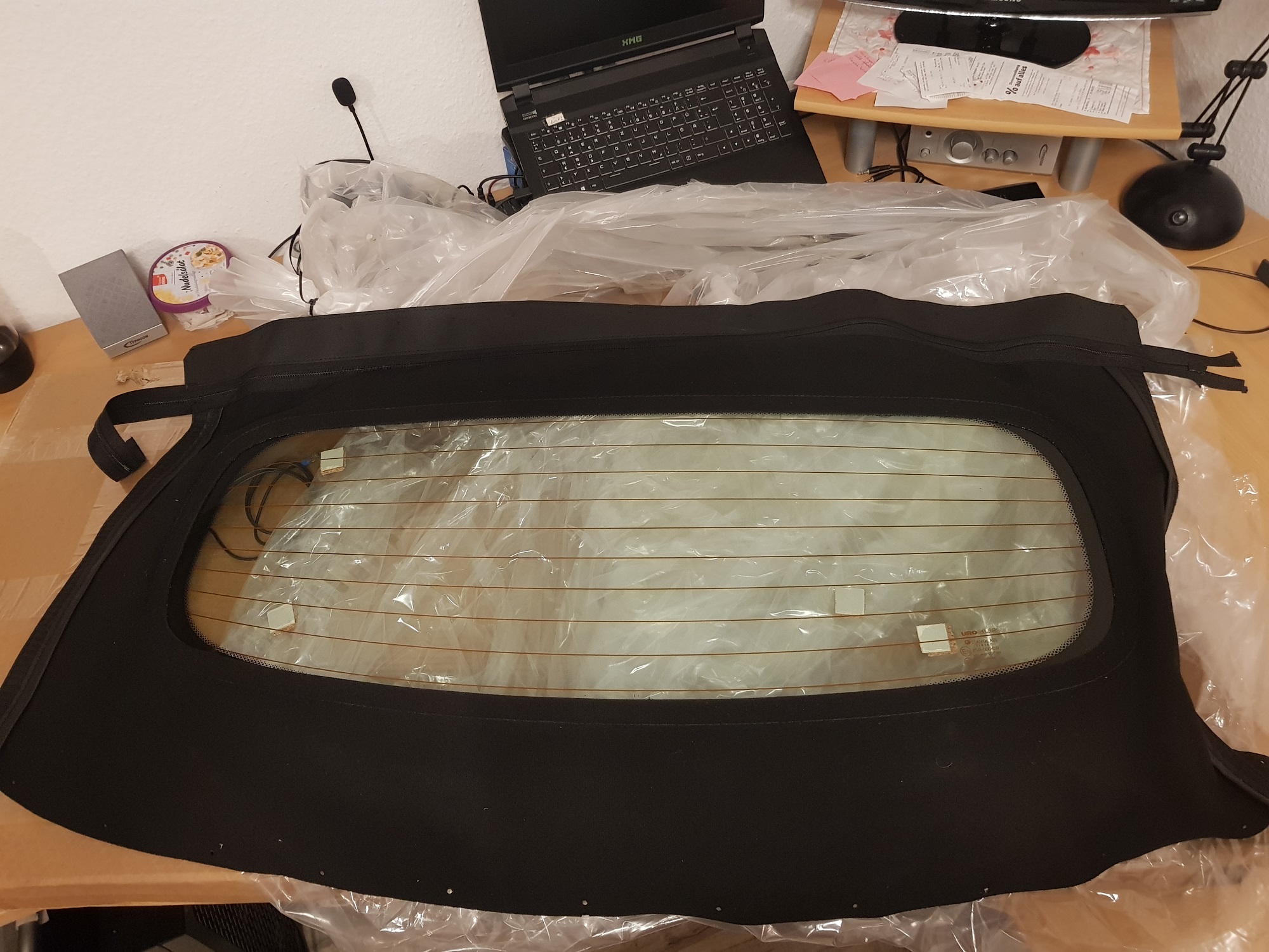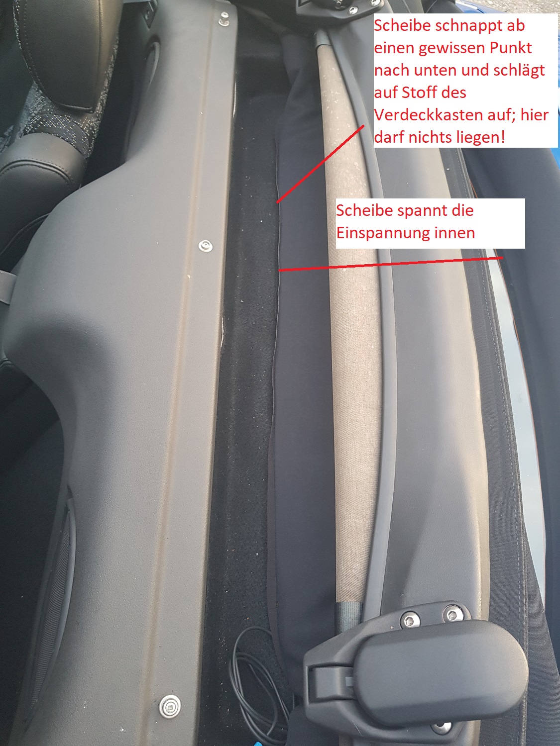Die Scheibe hat am Anfang richtig satt Spannung und schlägt auf den Stoff im Verdeckkasten . Wenn man dort was liegen lässt dann könnte sie bersten. Auch der Stoff um die Schebe/ die Einfassung der Scheibe wird sehr stark beansprucht.