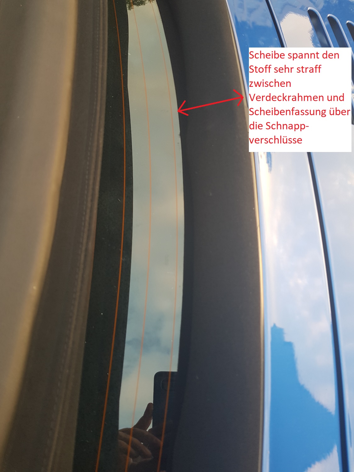 Nach Erfahrungswerten von MikeDD wird die Spannung im Stoff immer weniger mit der Zeit. Kann ich soweit bestätigen obwohl die Scheibe immer noch sehr straff liegt. Wenn man das zum allerersten Mal macht nach Einbau denkt man echt die Scheibe bricht.