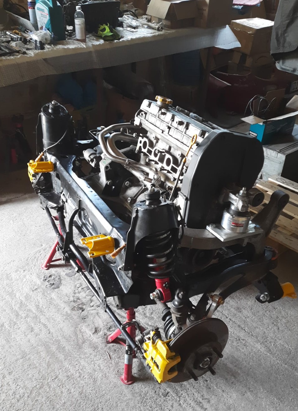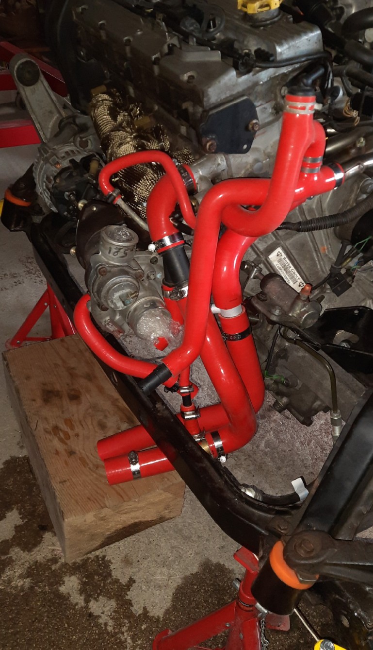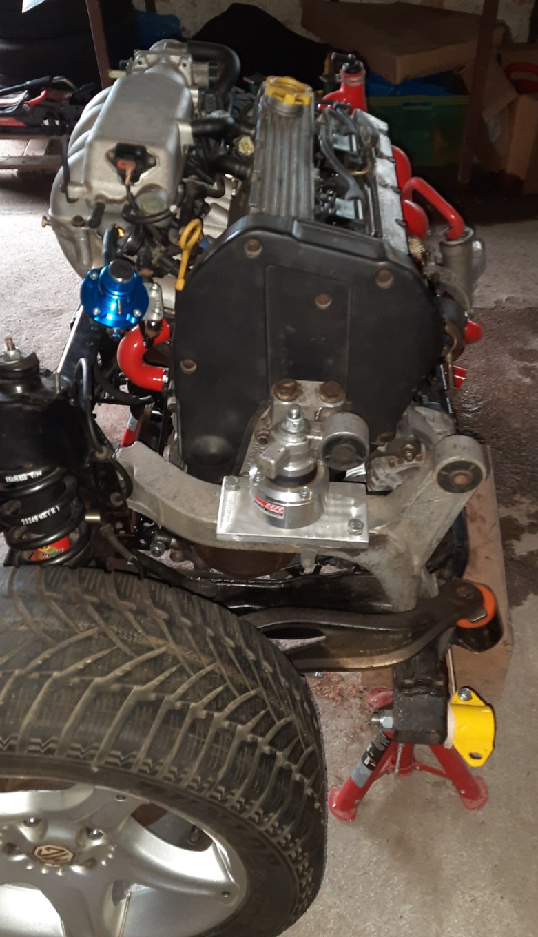 Gude! Langsaaaaammm Also Stand aktuell ist der, dass der Motor zusammen ist, Kupplung dran, Getriebe noch nicht, da musste ich ein bisschen auf die Werkstatt warten, bis die Zeit hatten, mir das Quaife LSD einzubauen, was jetzt vor ein paar Tagen gemacht wurde Nun kämpfe ich grad noch mit dem Kupplungsausrücklagerhebel, der über den Mike Satur Kupplungshebel aus rostfreiem Stahl drüber muss. Im Video vom Mike auf Facebook flutscht die Stange locker vom Hocker in diesen Hebel rein, aber grau ist ja die Theorie.... habe ihn jetzt so ca. 50% am Samstag mit Drehbewegungen und drücken reinbekommen, trotz WD40 und ein bisschen Fett, aber das Ding sitzt so stramm..... heute versuch ichs mal mit Heissluftgebläse, Hebel heiß machen, hoffentlich geht die Hebelstange dann besser rein. Gewalt und Hammer soll man ja tunlichst meiden, habe ich mal beim Mike gelesen, sonst kann man das Teil gleich wieder wegschmeissen, weil der Kupplungsmechanismus dann garantiert nicht lange leichtgängig ist.... Dann gehts dran, das Getriebe an den Motor zu schrauben, damit ich das ganze Gedöns auf den Hilfsrahmen setzen kann und ausloten, wo und wie weit ich das ganze etwas auf dem Rahmen nach hinten versetze, ca. 2-3cm sollen da schon fast reichen, damit man dann nur ein bisschen die Schottwand zum Tank eindellen muss, wenn man wie ich den original Turbokrümmer verbaut. Ich überlege noch, ob ich nur auf der Getriebeseite 2cm nach hinten gehe, dann sitzt das ganze halt etwas schräg, oder auf beiden Seiten, aber an der linken Motorhalterung sitzt das Lager auf einer leichten Erhebung auf dem Träger, der wiederum auf den Hilfsrahmen geschraubt ist und wenn ich nach hinten gehe, bin ich mit dem hinteren Schraubenloch von dieser ca. 2mm dicken Erhebung runter... auch nicht optimal. Die hintere Motorhalterung Ölwanne - Subframe muss eventuell dann auch ein neues Loch im Hilfsrahmen bekommen, da ich die Halterung selbst nicht kürzen will (dazu müsste ich sie auseinander sägen und wieder etwas verkürzt zusammen schweissen, was ich mir nicht so ideal für die Langlebigkeit vorstelle). Da ich auch gleich das Fahrwerk runderneuere mit PU-Buchsen an allen Stellen, neuen Dämpfern in den TF-Federbeinen (sind ja TF-Hilfsrahmen), TF- Lenkgetriebe, neue Lager für die oberen Querlenker von M. Satur usw.... wirds schon noch ein paar Wochen in Anspruch nehmen  Aber ich hoffe, das "Shakedown" wird noch vorm Sommer stattfinden