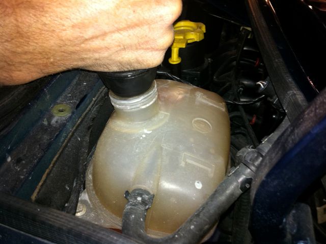 Wasserschlauch in den Ausgleichsbehälter, Brühe kam aus dem linken Schlauch am Unterboden gelaufen.