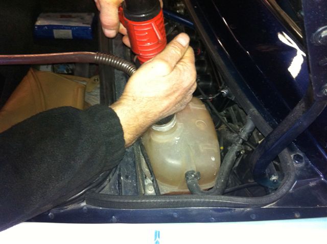 System mit Hochdruck spülen und gleichzeigtig mit neuem Kühlmittel auffüllen. Aufgrund des hohen Druckes entfällt das anschliessende Entlüften fast gänzlich.