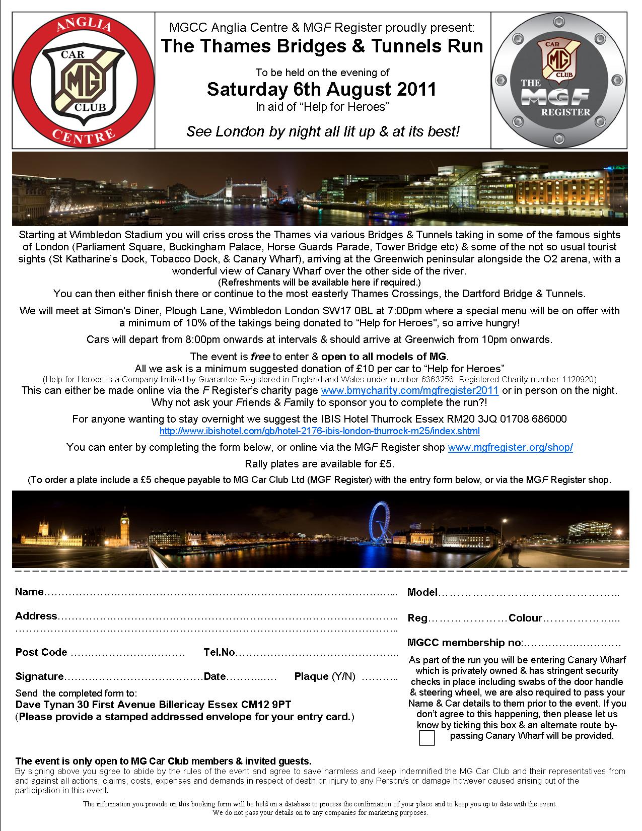 Am Samstag, dem 6. August (Sommerferien!) haben unsere Freunde vom MGF Register und vom MGCC Anglia Centre ein feines Event geplant, das man prima mit einer Urlaubswoche auf der Insel verknüpfen kann: The Thames Bridges and Tunnels RunWie der Name schon sagt, geht es an, unter und über der Themse entlang, drunter und drüber kreuz und quer durch London, und zwar bei Nacht! Von Wimbledon zum Buckingham Palace, an den Houses of Parliament vorbei, Tower & Tower Bridge, Canary Wharf und vieles mehr. Ende wird dann an der O2-Arena in Greenwich sein. Kurz gesagt also ein Trip "London by Night" im eigenen MG. Über ein Dutzendmal wechselt man die Flussseite und kriegt alle bekannten (und einige unbekannte) Sehenswürdigkeiten in ganz neuem Licht zu sehen. Außerdem lernt man eine Menge MG-Freunde aus ganz Europa kennen, denn die Belgier und Niederländer kommen auch! Und nun das beste: Die Teilnahme ist kostenlos! Das Ganze läuft zugunsten eines guten Zwecks, nämlich der diesjährigen Charity-Geschichte vom MGF Register ab. Von jedem Teilnehmer wird eine Spende (mind. £10 je Auto) für "Help for Heroes" erwartet, mehr Infos dazu hier. Treffpunkt ist Simon's Diner am Wimbledon Stadion, Plough Lane, Wimbledon (um 19 Uhr) zum Essen. Dieses Essen muss auch jeder selbst bezahlen und der Wirt gibt dann auch noch 10% vom Umsatz an "Help for Heroes" ab. Ab ca. 20 Uhr wird dann gefahren. Da nicht jeder so viel Erfahrung mit dem Autofahren in UK oder gar in London hat, werden alle auswärtigen Teilnehmer in einer Gruppe mit einem "local driver" starten. Eine Rallyeplakette gibt's für £5 vorab im Online Shop des MGF-Registers, wo man sich auch zur Teilnahme anmelden muss, es gibt aber auch ein Formular zum Download. Denn: Auch wenn's nichts kostet ist eine Anmeldung unbedingt erforderlich. Einmal, weil die Jungs natürlich planen müssen, aber vor allem auch, weil es durch den Business Distrikt von Canary Wharf geht, und dort gelten strengste Sicherheitsvorkehrungen. Nur gemeldete Fahrzeuge und Personen dürfen da rein und auch nur dann, wenn man sich einer entsprechenden Kontrolle unterzieht, inkl. genetischem Fingerabdruck von Türgriffen und Lenkrad. Wer das nicht will, kann aber alternativ auch eine andere Route fahren. Weitere Infos folgen noch, hier der Link zur Event-Website beim MGF Register, von da aus geht es weiter zur Registrierung: http://www.mgfregister.org/MGFRegister/ ... unnels.htmVielleicht wäre es sinnvoll, von hier eine Gruppe zu bilden, damit man beispielsweise die Fähre gemeinsam bucht oder das Hotel. Adrian hat da schon was organisiert ... Gruß Mykel