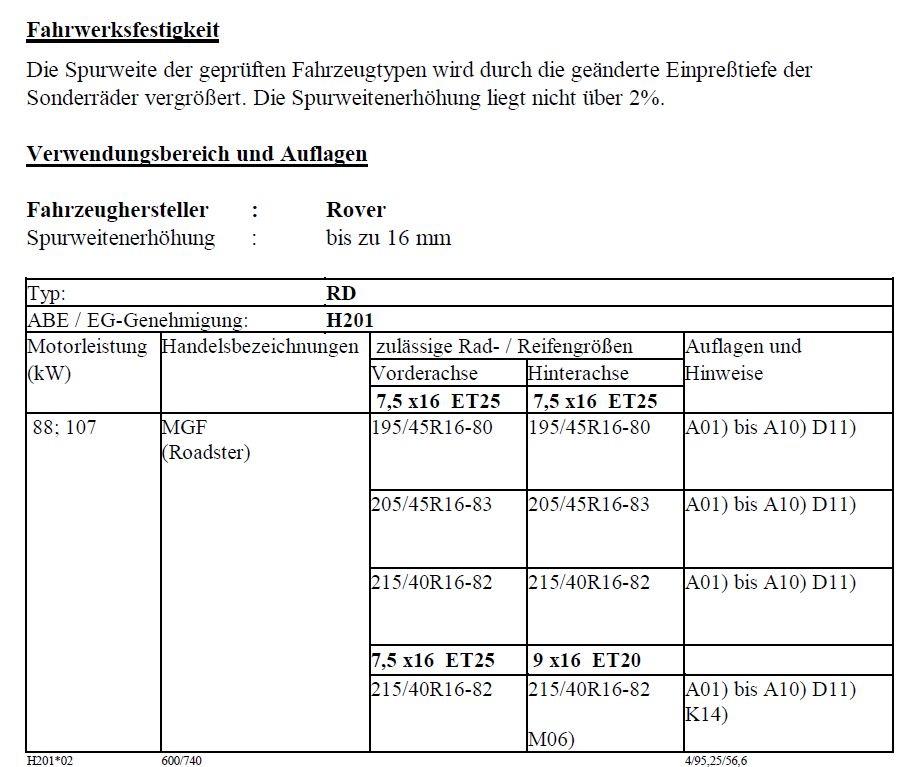 Hab jetzt durch zufall eine RH Felgen ABE für den MGF gefunden, wo die 205/45 R16 Reifenkombinationen getestet und genehmigt wurden... (weil Spurweitenerhöhung unter 2 % liegt)