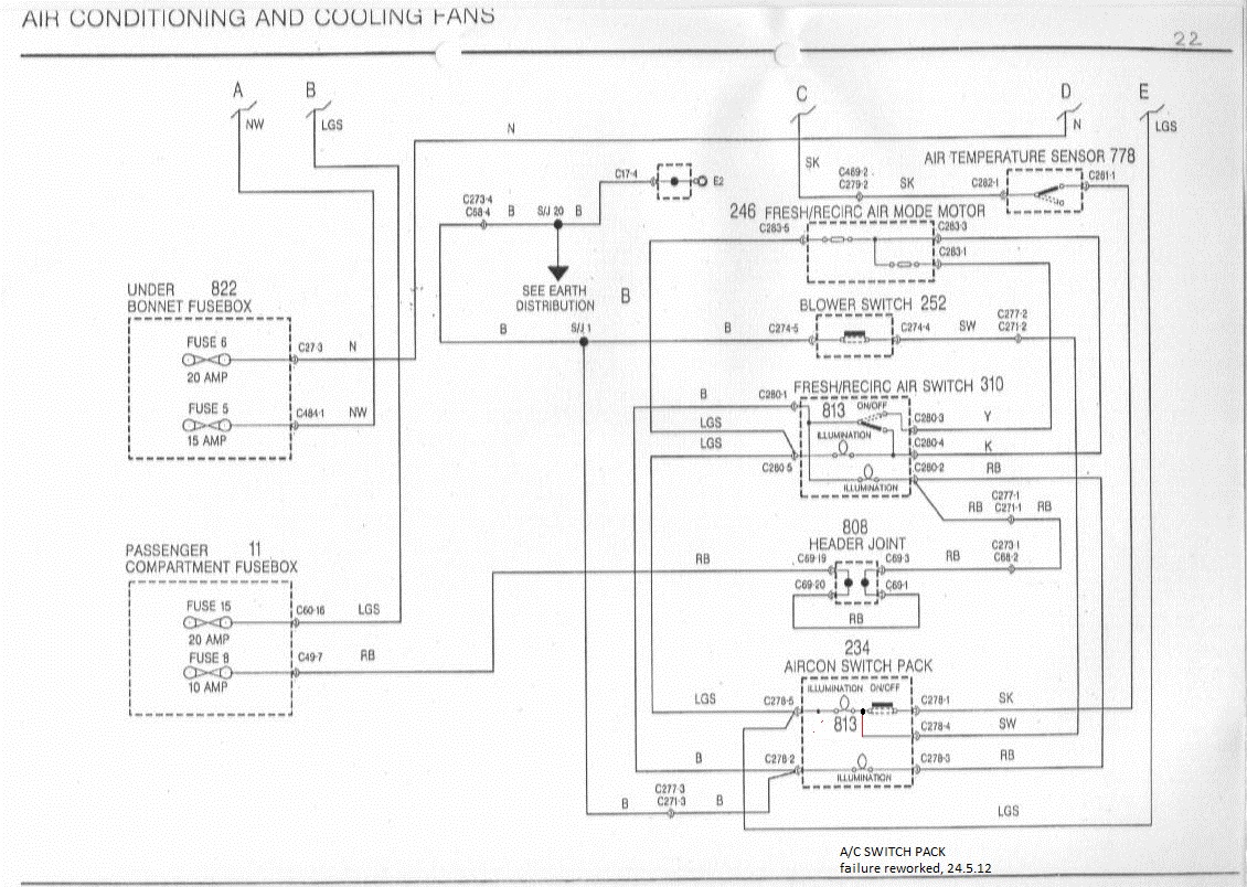 Zuerst mal, in den Schaltplänen ist ein Fehler. im Aircon Switch Pack 234 ist der SW ausgang nicht vor, sondern hinter der Glühlampe. also zwischen Lämpchen und schalter.