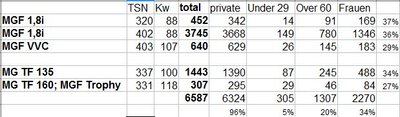 Was ich sehr interessant finde, ist dass es in UK noch rund 45.000 Fs und TFs gibt (je etwa zur Hälfte), aber immerhin noch 35.000 MGB! Mal sehen, wie lange es noch dauert, bis unsere Schätzchen seltener geworden sind als der Opa.