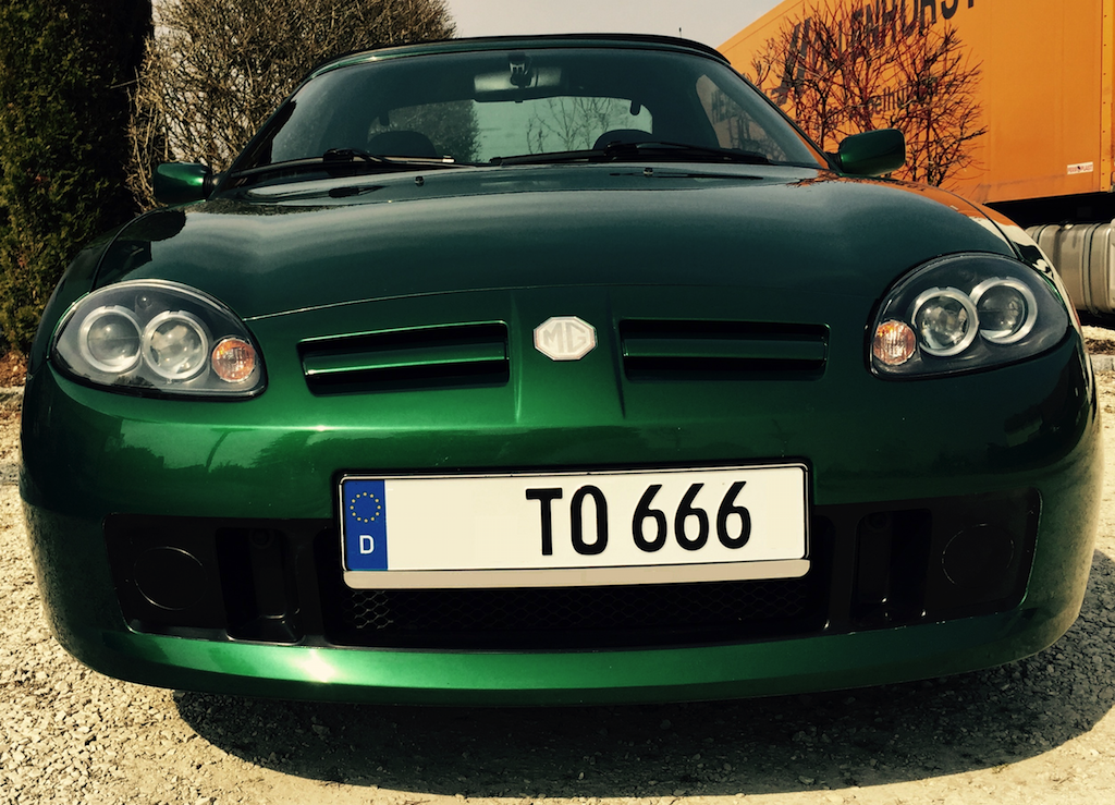 Auf dem Typenschild unter der Fronthaube, hinter dem ABS-Block. Da steht Lackfarbe und Innenausstattung. Farbe ist bei dir HFF, also British Racing Green pearlescent. Dunkleres Grün gab es nur bei einer Sonderauflage vom MGF, das war die Brooklands Edition (oder in UK: Abingdon SE). Die Farbe hieß dann auch Brooklands Green (HYF), war aber ein einfacher Lack, kein Metallic. Beim TF gibt es noch die Farbe Le Mans Green (HFN), die ist aber etwas heller und bläulicher. Ich persönlich finde grün und silber bei den F und TF ziemlich langweilig, wenn ich ehrlich bin. Da hat aber jeder seine eigene Meinung zu, und meinen „Malkasten“ (TF in Monogram Spectre) oder Mrs Pee (den Steppy in Klokachelblau) mag hier auch nicht jeder.