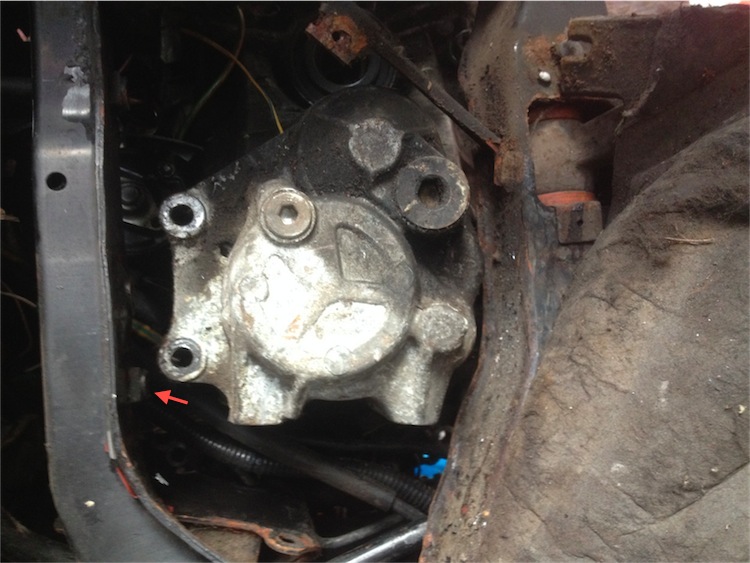 Knöchel is abgeschwollen und ab unters Carport ! Willkommen bei " Russisch-Schrauben für Fortgeschrittene ! " oder alternativ " KUHFUSS RULEZ " Ich hatte halt als Aufgabe die Kupplungsglocke vom Motorblock abzuziehen und das war echt ne harte Nuss !! Prof. Honigtaus´ Erkenntnisse  : 1. man kann den Subframe einseitig lösen , ohne das er grossartig unkontrolliert herunterkracht ... Bei mir kam er auch gerade mal 2,5 Zentimeter , also weit weniger als auf dem Photo von Speedsgood ! Man muss den ablassen , damit man an den Kühlrohren vom Motorblock mit der Kupplungsglocke vorbeikommt. So, sieht das jedenfalls aus ... 2. Motorblock muss man auch nich sichern , bleibt da wo er ist ... 3. Man muss die Kupplungsglocke ein wenig drehen , damit diese überhaupt durch das "Fenster" passen kann und nicht an den Gewindehülsen ( Pfeil ) vom Subframe hängenbleibt ... ist bei ein paar passiert, den ich hab mich seitlich unter den Motorblock gelegt und mit der Kraft meiner Beine versucht die Kupplungsglocke komplett abzuziehen/abzutreten.. Zuerst mit dem Kuhfuss , das ging leider nicht weit genug. Zuwenig Hebel  Ich hab halt keine Bühne und nur 40 cm zum Boden. Dateianhang: