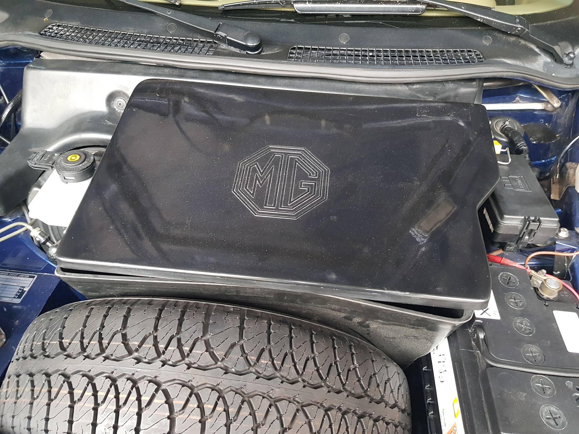 Kleines Update; Ich konnte mir die original deutsche Frontbox besorgen und heute einbauen. Die original Box ist gegenüber dem Nachbau von COWAPARTS etwas größer. Der Einbau der Box ist durch die gesteigerte Größe etwas sperriger. Die Box klemmt tatsächlich zwischen Ersatzrad und der unteren Blechwand. Die Box ist auch höher und wird von der Motorhaube berührt. Alles in allem ist die Passform besser als bei der Nachbaubox, die dafür etwas mehr glänzt und nicht so eingeklemmt wird. Dateianhang: