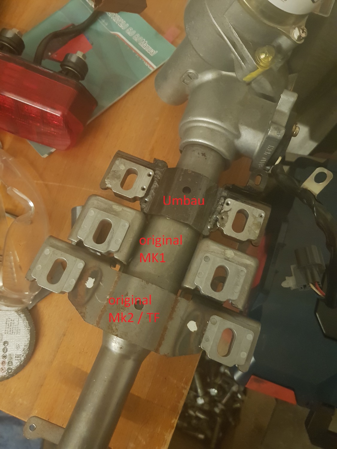 Lenksäule eingebaut. Wie ich erfahren habe gibt es unterschiedliche Lenksäulenverkleidungen für die Mk2 / TF. Die vom Mk1 scheint aber grundsätzlich auch zu passen.