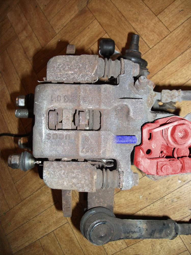 Meine Erfahrung ist, dass in dem Fall (Lampe bleibt an) meist eine der Handbremsmechaniken im Bremssattel hängt. Zieh mal die Handbremse an, mach den Hebel dann wieder los und schaue hinten nach, ob beide Hebel (im Bild rot gemacht) wieder in die Ruheposition auf der Nase (im Bild blau) zurückgehen. Wenn die unten bleiben, dann hängt die Mechanik. Typisches Problem beim F und TF. Dateianhang: