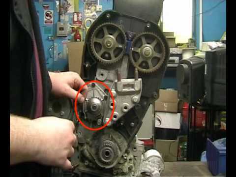 In der Tat, das hört sich sehr nach ner undichten WaPu an. Die sitzt an der Stirnseite vom Motor, im Zahnriemenkasten, unterhalb der Spannrolle (die im Bild demontiert ist): Dateianhang: