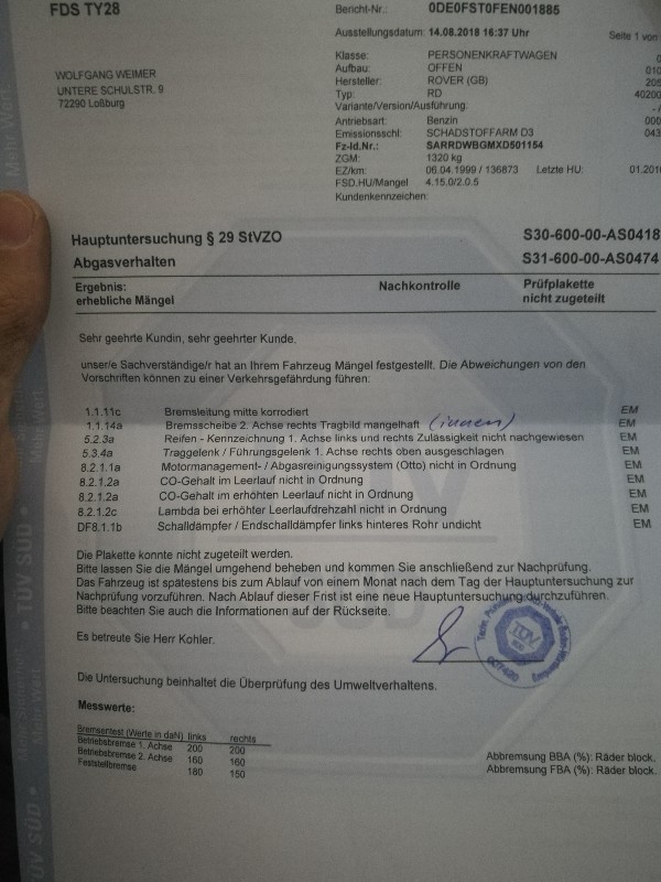 Nachtrag: War heute zur Nachuntersuchung und der TF hat ohne Probleme bestanden. Unterschied zur vorherigen Untersuchung: - Den Kat von Bandel habe ich abgebaut und in die Tonne geschmissen und meinen 15 Jahren alten Originalkat wieder druntergebaut. Dies ist meine eigene Erfahrung und die muß nicht auf andere zutreffen. Zusatzinfo zum Kat von Bandel: Artikelnummer:11009129 https://www.bandel-online.de/abgasanlage/katalysatoren/katalysator_kat_mg_f_rd_tf_16_18_115-160_ps_i40_38794_0.htmDer Hersteller ist EEC (European Exhaust +Catalyst LTD. ) Typ: EC1100.03 Das E-Zertifikat wurde am 11/04/2011 in Madrid vom Ministerio de Industria, Turisma y Comercio ausgestellt und liegt beim Kauf als Kopie in spanisch bei. Grüße, Pascal