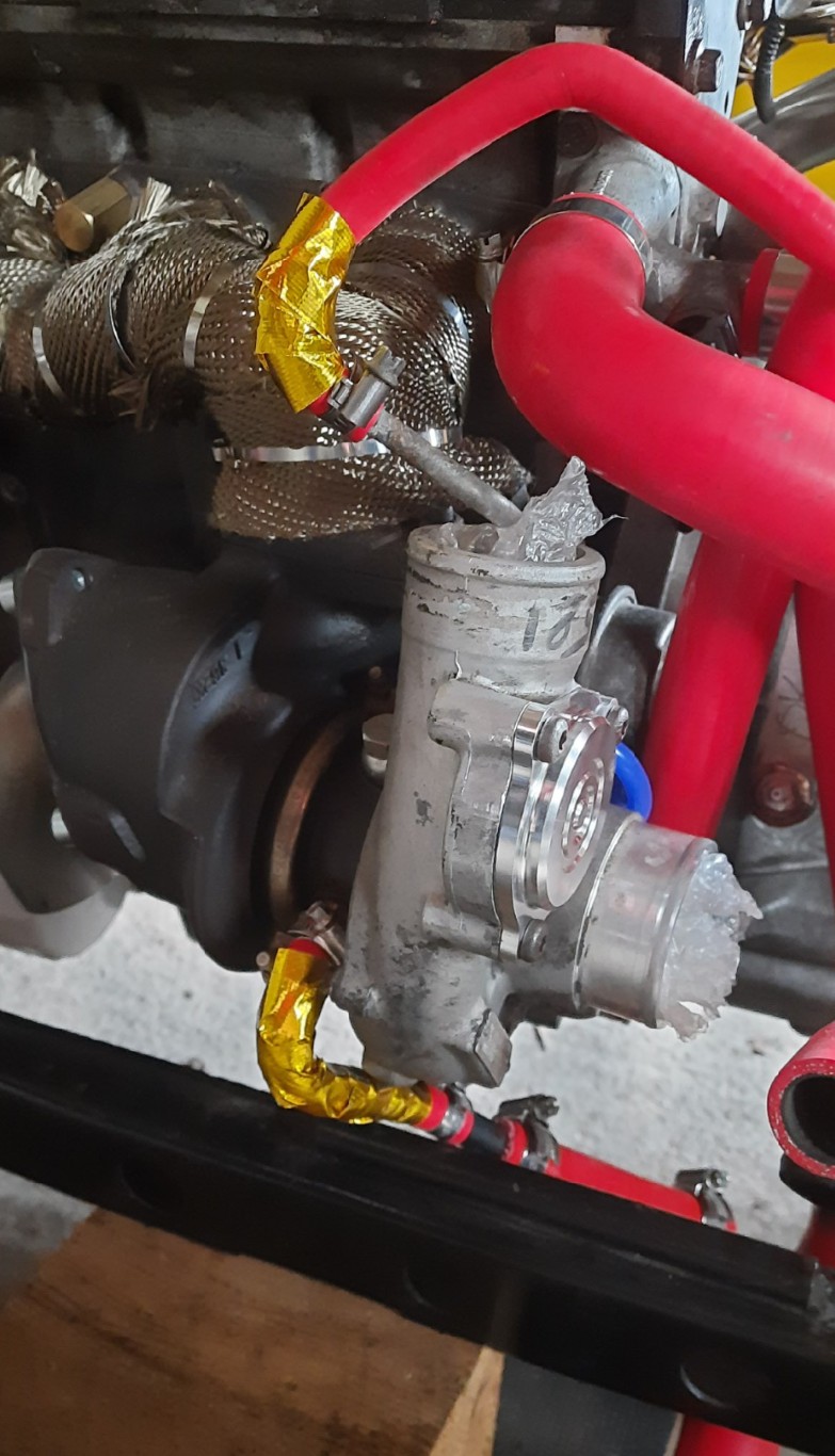 Peter B hat geschrieben: Nächster Punkt: Kühlung des Turbo, ist ja ein GT2552LS vom R75 mit wassergekühltem Turbogehäuse. Habe lang rumüberlegt, wie ich die Anschlüsse mache, zumal der Platz elendig eng ist an der Stelle, wenn der ganze Kram erst mal wieder im Motorraum drin steckt. Aber ich habe es nun so vor, dass von den Kühlschläuchen, die zum Frontkühler und zurück gehen, der Turbo mitgekühlt wird. Dafür brauchte ich entsprechende T- bzw. Y- Rohrstücke in passenden Durchmessern jeweils. Auf dem Bild sieht man ein bisschen das ganze Gewurschtel  Ich hoffe, es bleibt dicht und für Hitzeschutz muss natürlich noch mit Hitzeschutzmatten/folien gesorgt werden. Brauchst du auch einen größeren Kühler für die zusätzliche Wärme im Kühlkreislauf oder reicht der normale? Du könntest das System ja auch um eine Wasser-Methanol-Einspritzung erweitern