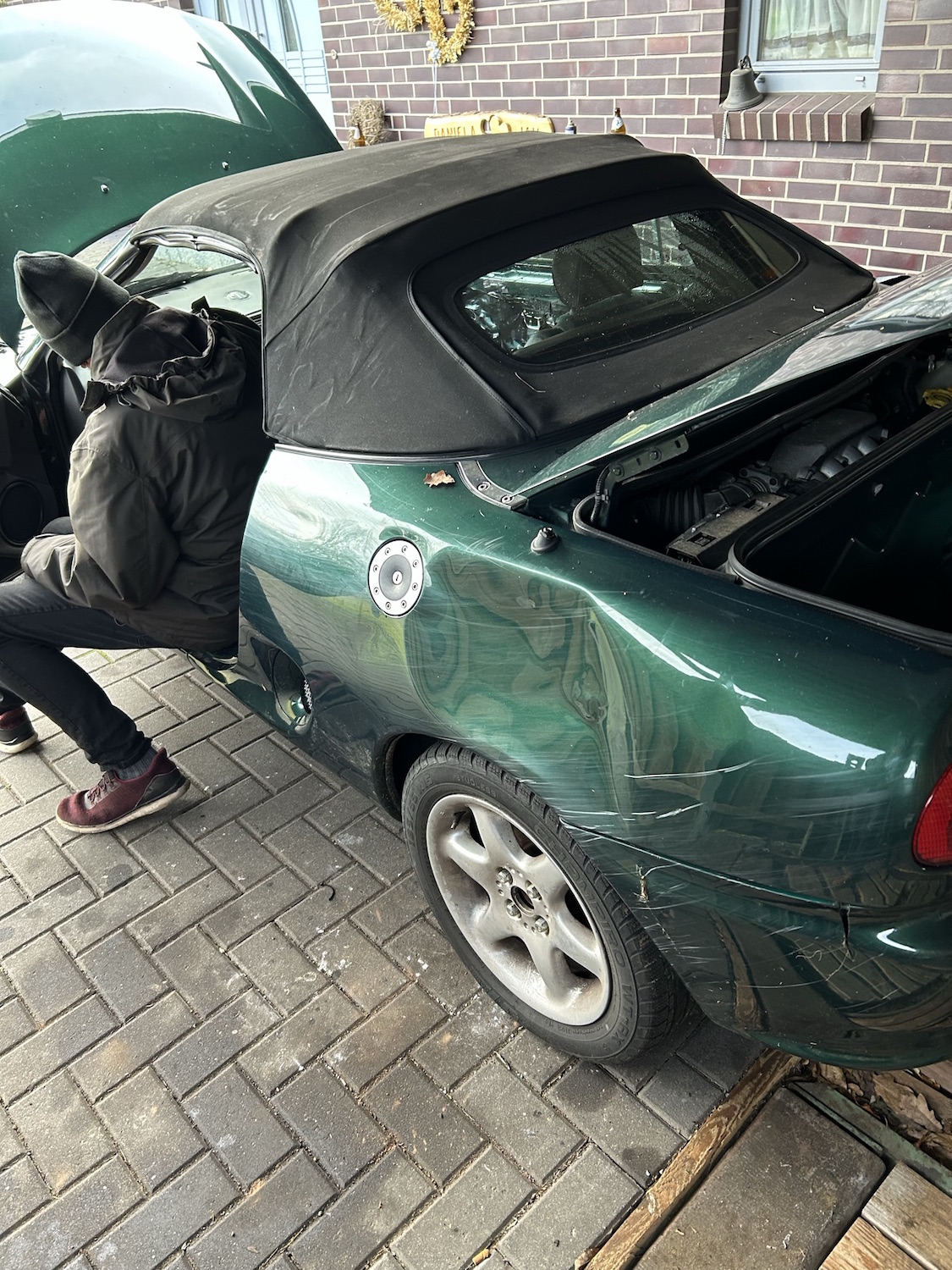 Und ohne Thorsten, dem Fischflüsterer, hätt ich GAAAANZ SICHER noch mehr kaputt gemacht. Er hat die Karre Original mit nem gebogenen Draht aufgemacht. Er hat da auch echt lang dran gedengelt und nich ein Bullenwagen hat angehalten, als 2 zwielichtige Gestalten bestimmt ne Dreiviertelstunde an nem Sportwagen mit nem Draht zugange waren ... Ich war echt nicht geduldig und wollt schon wieder mit den Kuhfuss durch die Scheibe. "Aber neee warte mal, ich habs gleich..." waren seine Worte und tatsächlich, nach nem Kaffe und nem zweiten Anlauf war er dann auf. Ganz starker Auftritt, Todde !