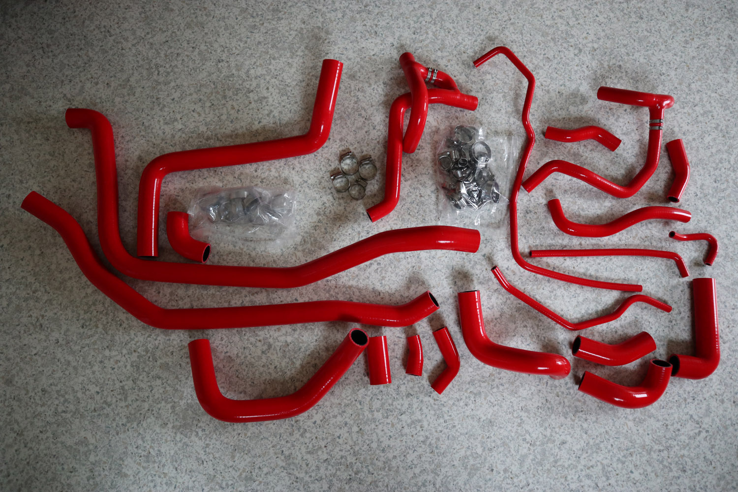 Demnächst will ich dann loslegen und mich an den Zahnriemenwechsel am Trophy wagen... Da auch die Kühlflüssigkeit nach nun geschätzt 10 Jahren Dauerbetrieb (seit letzter ZKD) gewechselt werden soll und einer meiner Schläuche des Wasserkreislaufs eh schon anfängt durchzuscheuern, dachte ich mir, "no risk - much fun" und warum nicht gleich die anderen mit austauschen. Hätte natürlich auch Standardschläuche in Gummi, schwarz nehmen können, aber warum nicht ein bisschen Farbe in den Motorraum und vorn an den Kühler bringen, auch wenn man es nicht sieht? Okay: hat jemand nen Tipp für ne durchsichtige Hutablage? Silikonschläuche von Roose Motorsport incl. neuer Schlauchschellen: