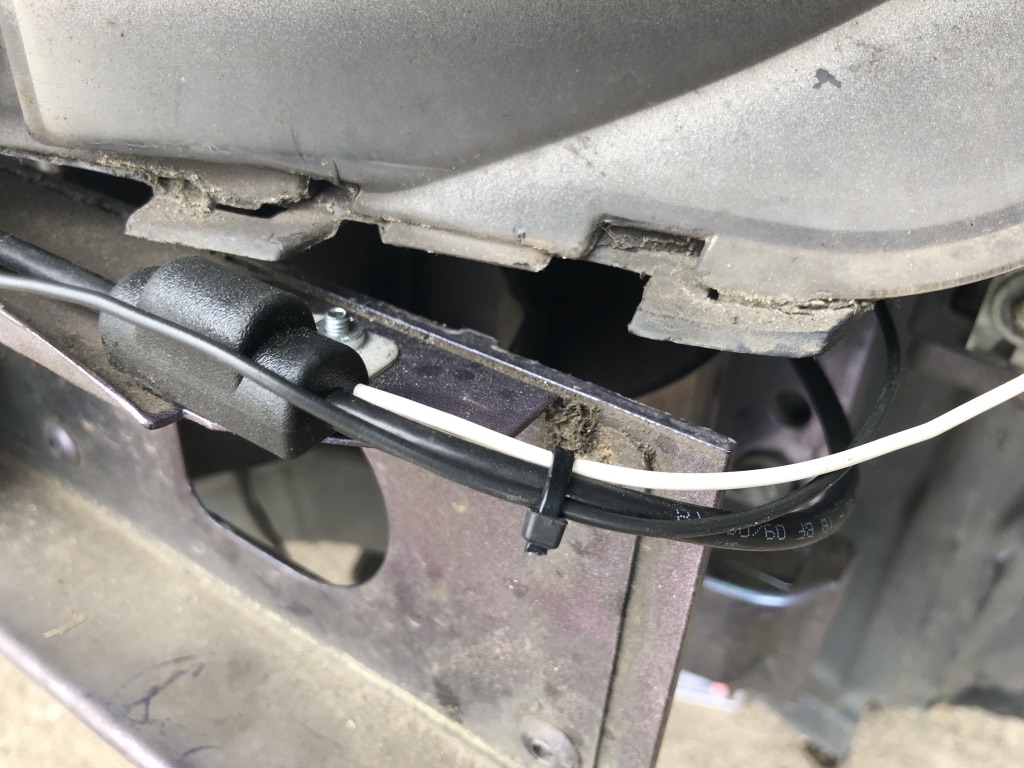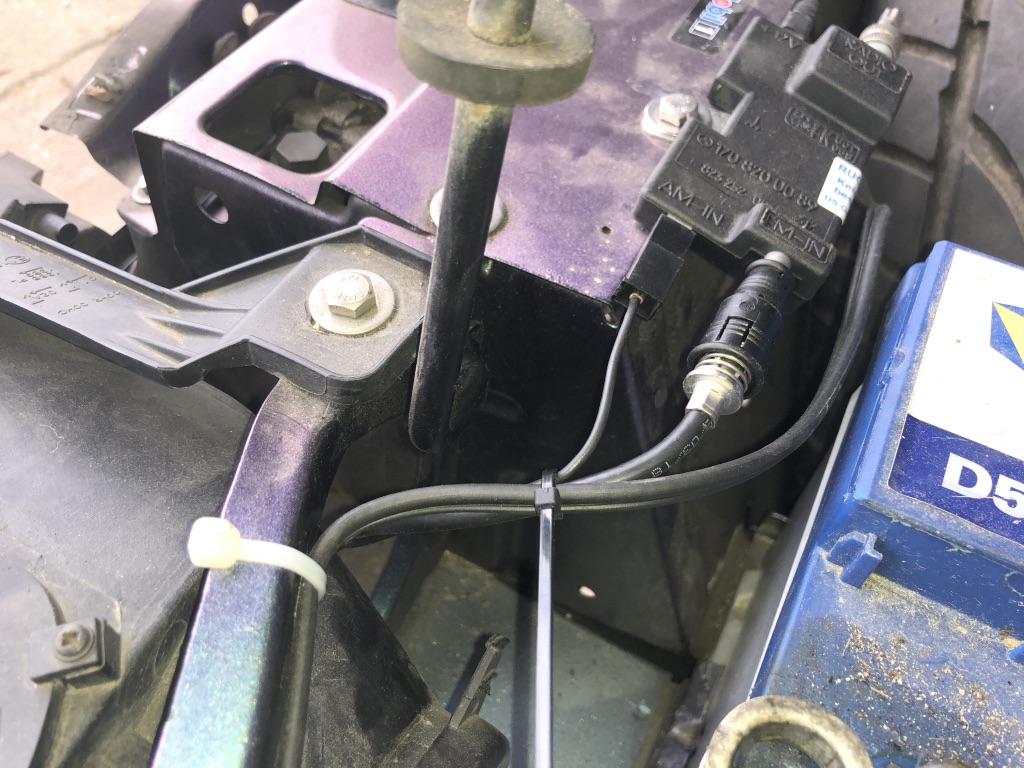 Die Mittelwellenantenne (wer’s braucht  ) kann dann an den UKW-Verbindungskabel mit Kabelbindern festgemacht werden; zentral hab ich beide Kabel mit einem Kabelbinder unter die Stütze des Haubenschlossblechs geklemmt (Kabelbinder natürlich vorher passend gekürzt): Dateianhang: