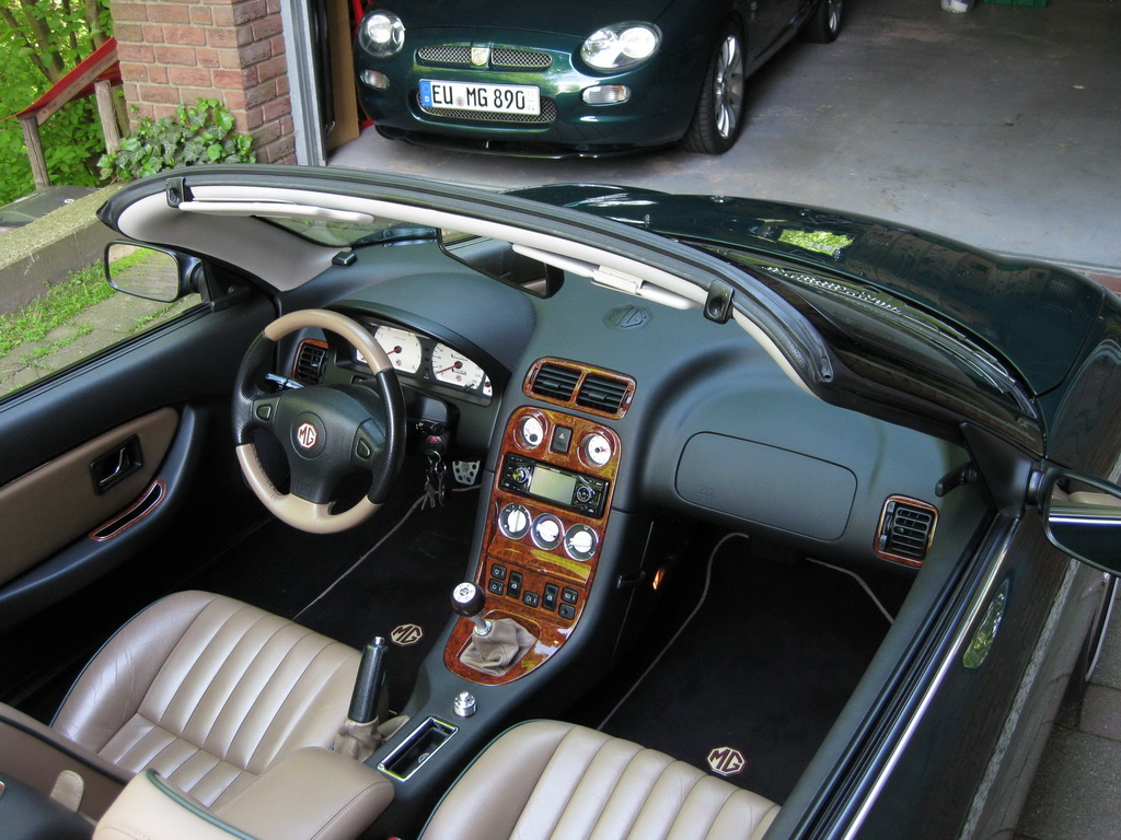 ehemals: MG-TF 135 Cool Blue bj.2004 BAS Glasheckscheibe, Stormwipers Single Wiper Kit, Startknopf, Mittelkonsolenumbau auf doppel-din, edelstahl Kühlwasserrohre, Türteppich gegen Alubleche getauscht