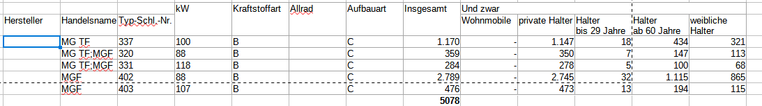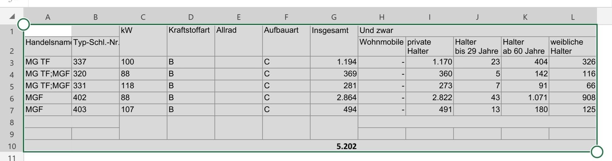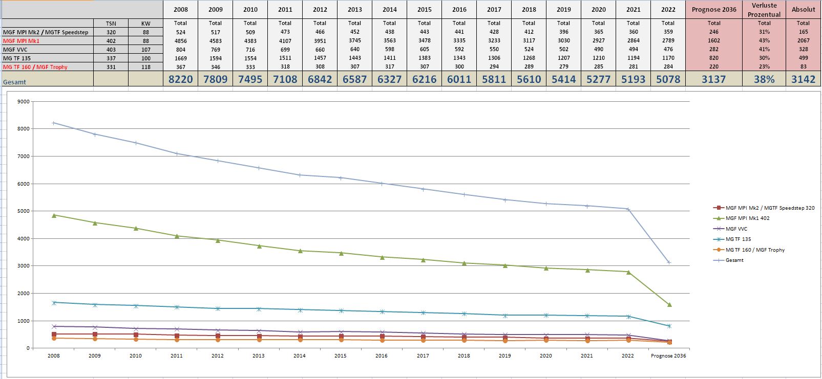 Vielen lieben Dank wudda, du bist der Zahlenmeister! Ich hab hier eine Excel wie deine. Hast du ggf. noch Zahlen von 2014 / 2012 und irgendwas vor 2010. Wenn es so weiter geht dann fallen wir nächstes Jahr unter die 5000 in Deutschland. Nur wenn es interssiert, hier mal grundete Zahlen aus England (06/2022): 3100x angemeldete MGFs 5500x angemeldete MGTFs Grüße aus Chemnitz