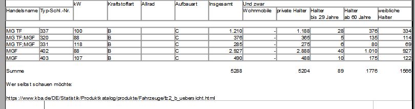 Vielen lieben Dank wudda, du bist der Zahlenmeister! Ich hab hier eine Excel wie deine. Hast du ggf. noch Zahlen von 2014 / 2012 und irgendwas vor 2010. Wenn es so weiter geht dann fallen wir nächstes Jahr unter die 5000 in Deutschland. Nur wenn es interssiert, hier mal grundete Zahlen aus England (06/2022): 3100x angemeldete MGFs 5500x angemeldete MGTFs Grüße aus Chemnitz
