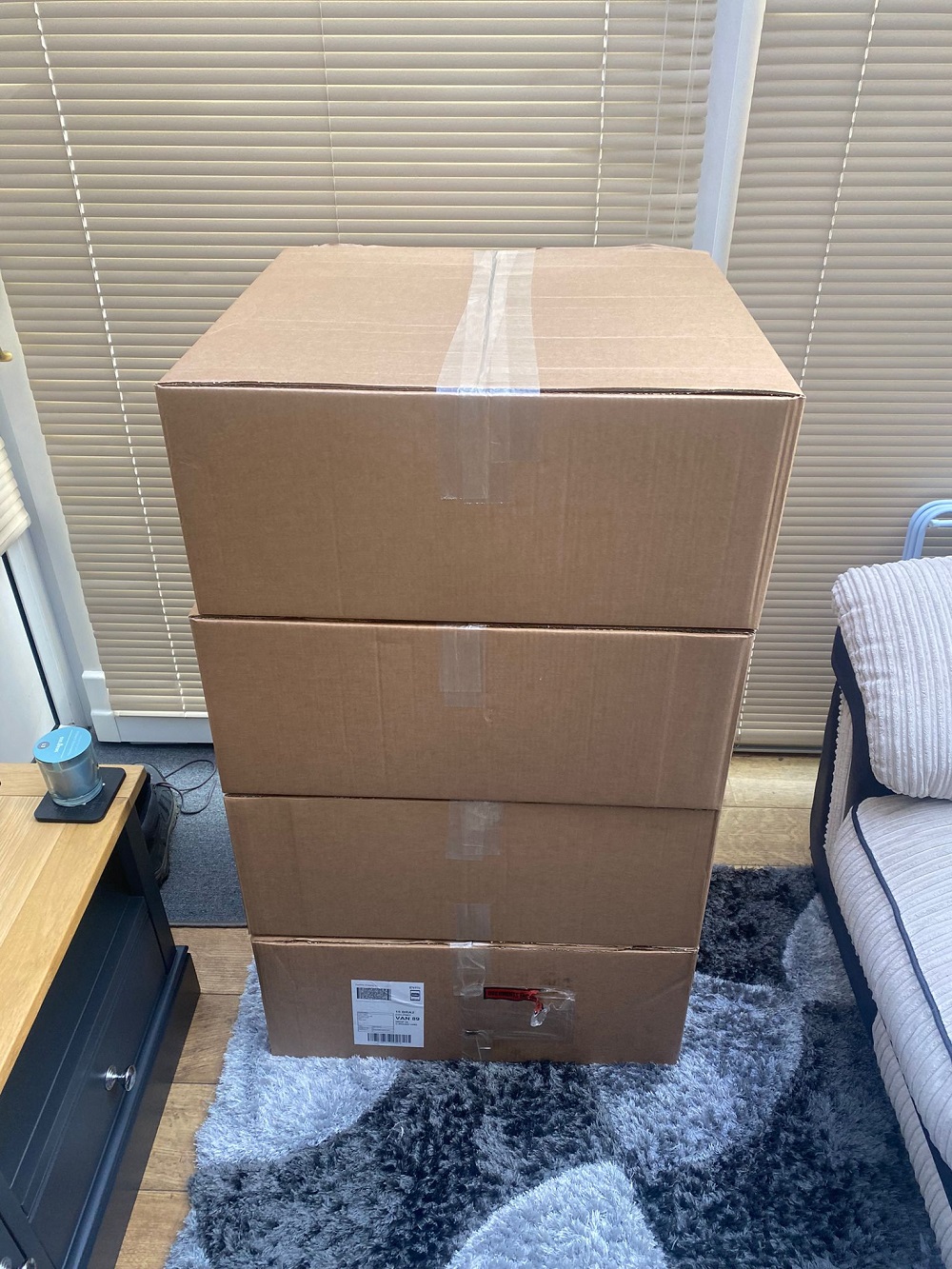So, der Deal ist gerade zustande gekommen. Habe gerade gesehen, dass der Euro abgestürzt ist bzw. der Pfund gestiegen. Das wird teuer ! Ich schätze mit Versand/ Zoll / Lackierung / neuen Reifen werde ich für den ULW Radsatz plus 3 ULW Ersatzfelgen um die 2-3T€ ausgegeben haben. Ich mache später eine Rechnung auf was der ganze Spass gekostet hat. Aber erstmal liegen die Dinger beim Verkäufer in England, der urspünglich nicht versenden wollte. Ich hatte in Ebay.uk. 4x 62x62x30 cm Kartons gekauft und Ihm zuschicken lassen. Er hat sie daraufhin verpackt: Dateianhang: