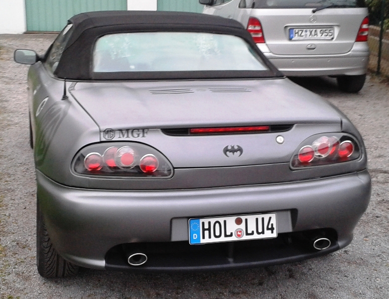 nun ein paar Bilder meiner bisher kurzen aber nicht langweiligen MG Geschichte Tag 1 war ein Nockenwellenschaden Tag 2 nach 5 Wochen Motorinstandsetzung war auch nicht besser .... im Regen das Fahrverhalten etwas unterschätzt und Leitplanke getroffen. als erster Schritt für 2014 habe ich die Felgen mit Sprühfolie lackiert damit ich jederzeit wieder auf silber zurück kann. -und dann kam nach einigem hin und her was die Wahl der Farbe betrifft die Entscheidung zu grau matt metallic. und mir gefällt das Gesamtergebnis sehr. Das Batman Logo gefiel meinem Sohn sehr...