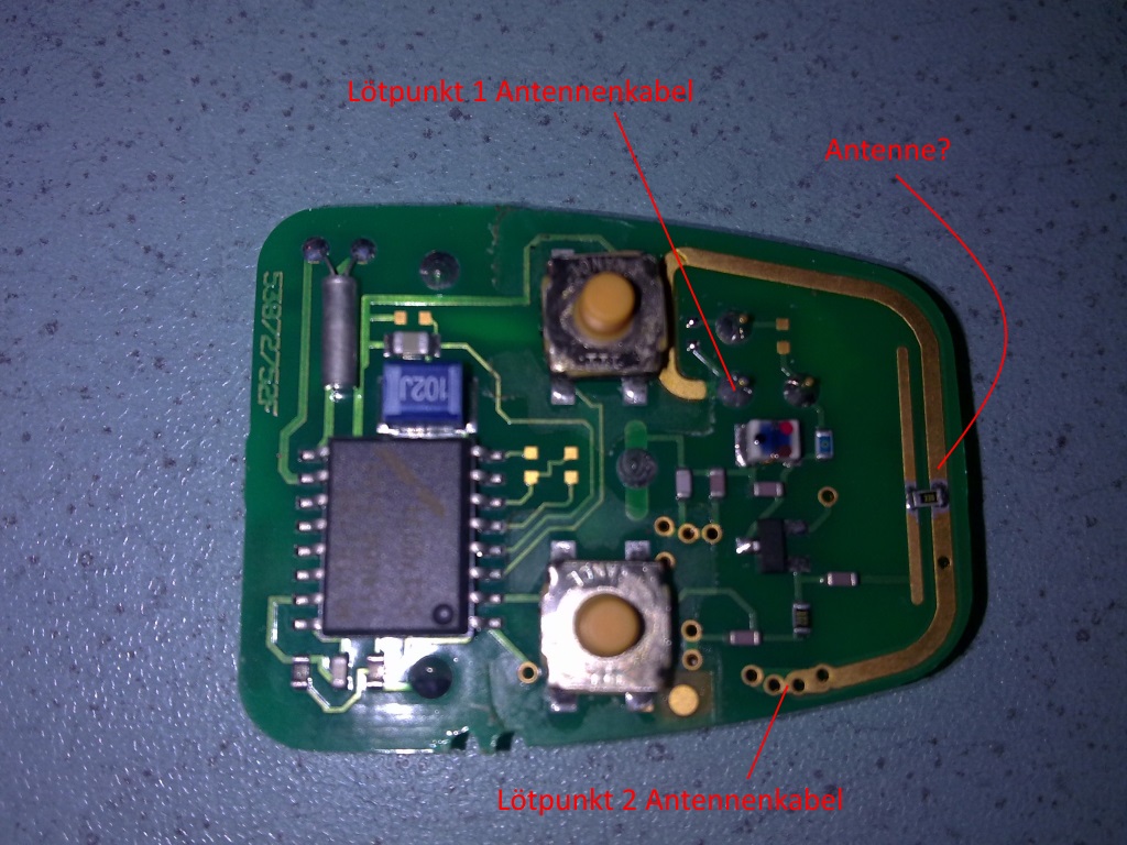 Ähm, kurze Frage an die Alteingesessenen. Es gibt jemand in England der konnte die Reichweite der Fb mit dem Anlöten eines 20 cm Kabels (Antenne) verbessern (4-10 Meter vom Auto weg anstatt nur direkt am Fenster). Leider ist auf dem Bild nicht zu erkennen wo die Lötpunkte für die Antenne sind. Weiß das rein zufällig jemand?