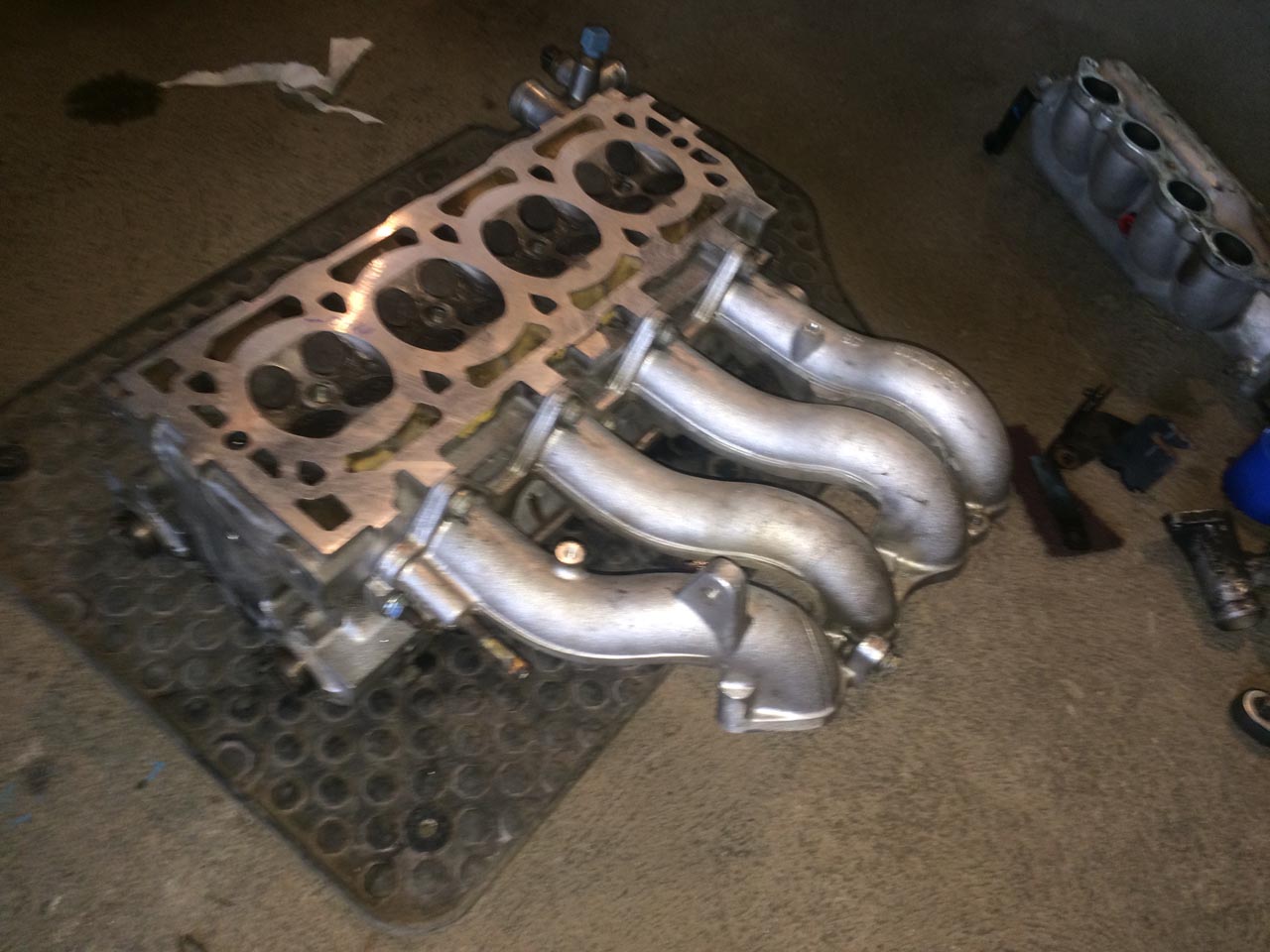 So, wir waren in den letzten Wochen nicht untätig! Es ist einiges passiert, als erstes wurde mal der Innenraum wieder komplettiert, d.h. alle Instrumente und die Mittelkonsole sind wieder drin. Im Prinzip ist der Wagen von daher “fahrfähig”  Leider vergessen Fotos zu machen, aber das ist auch alles noch viel zu dreckig. Vor ein paar Wochen haben Markus und ich dann den Lader mit dem Krümmer verheiratet (Gun Gum hilft  ) und das Teil reingewuchtet. Dann den Zylinderkopf wieder drauf und das war’s dann erstmal. Dateianhang: